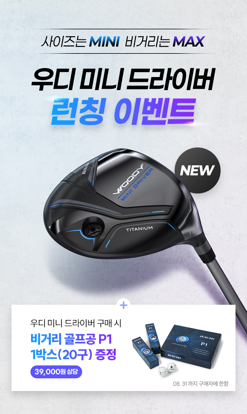 신제품 우디 미니드라이버 출시를 기념하여 런칭 이벤트를 준비했습니다. 7월 31일까지 구매하시는 분들에 한해 비거리 골프공 P1 한 박스를 선물로 드립니다. 새로운 우디 미니 드라이버에 골퍼 여러분들의 많은 관심 부탁 드립니다.